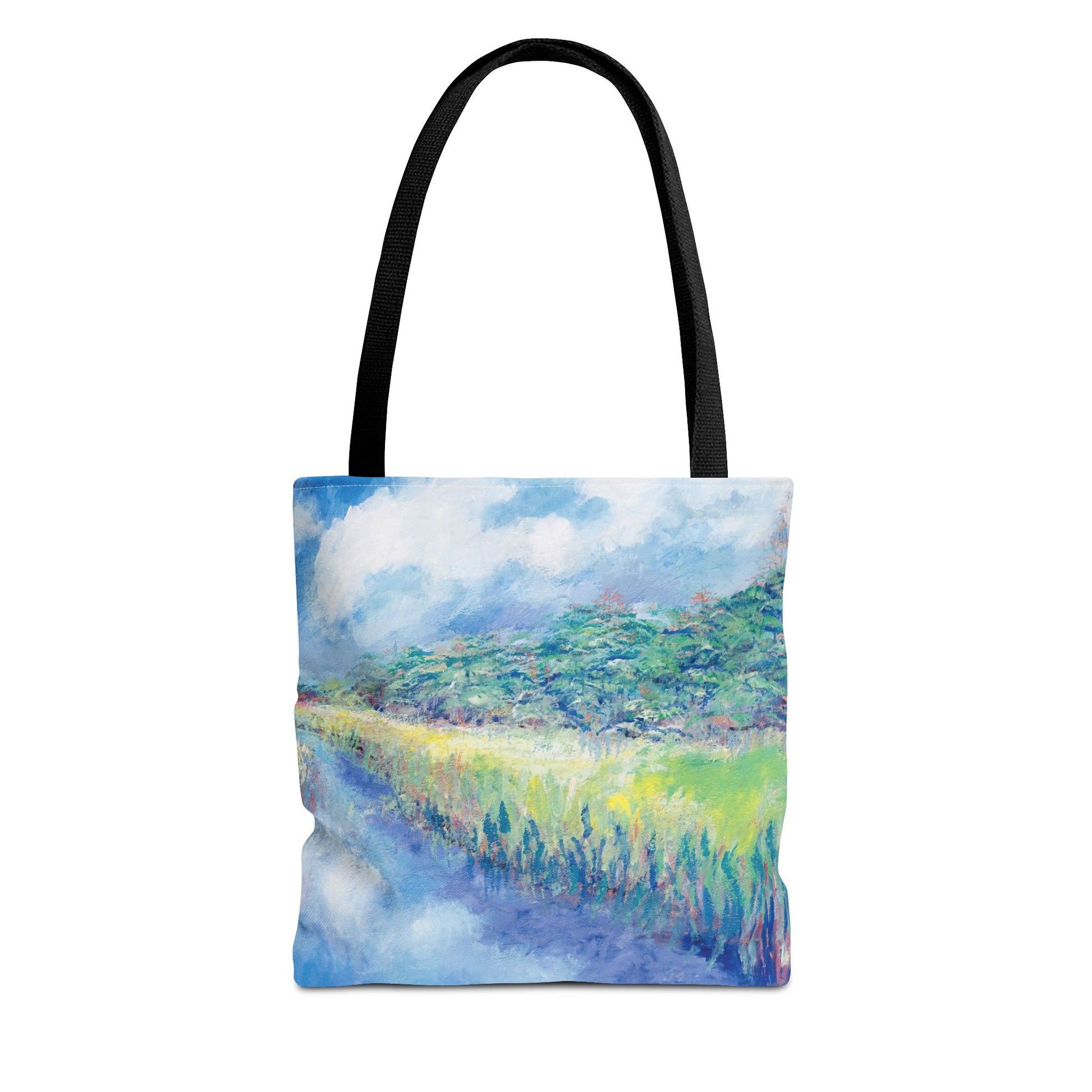 Leslie Karpinski's canvas artwork "Davis Canal" printed on a canvas tote bag. The bag is available in 3 sizes and with different color handles.