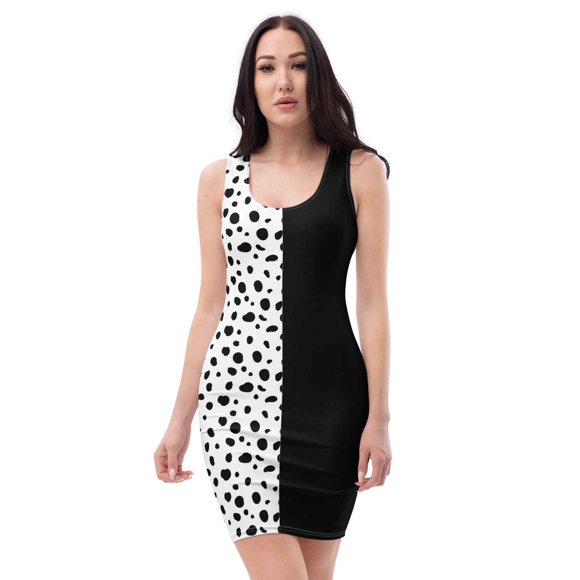 Our fun half black and half Dalmatian print womens body con style dress. The fit is tight to the body and has 18% spandex for stretch.