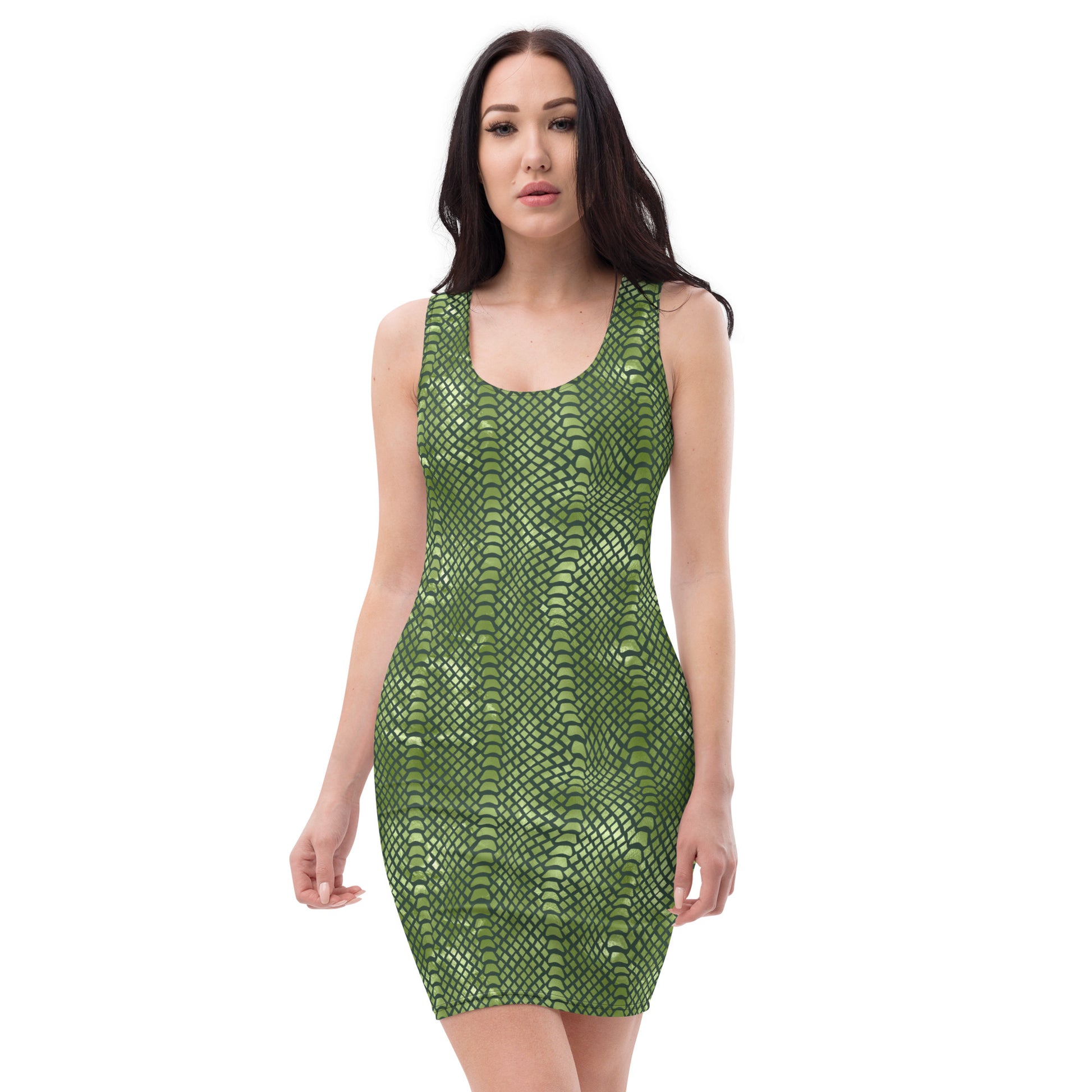 Our fun green reptile print womens bodycon dress. The fit is tight and has 18% spandex for stretch.