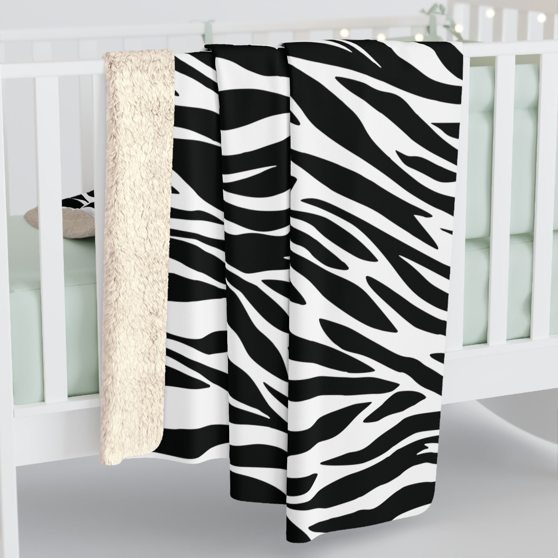 Our soft and cozy black and white zebra print blanket made with Sherpa fleece on the backside and printed on the front side.
